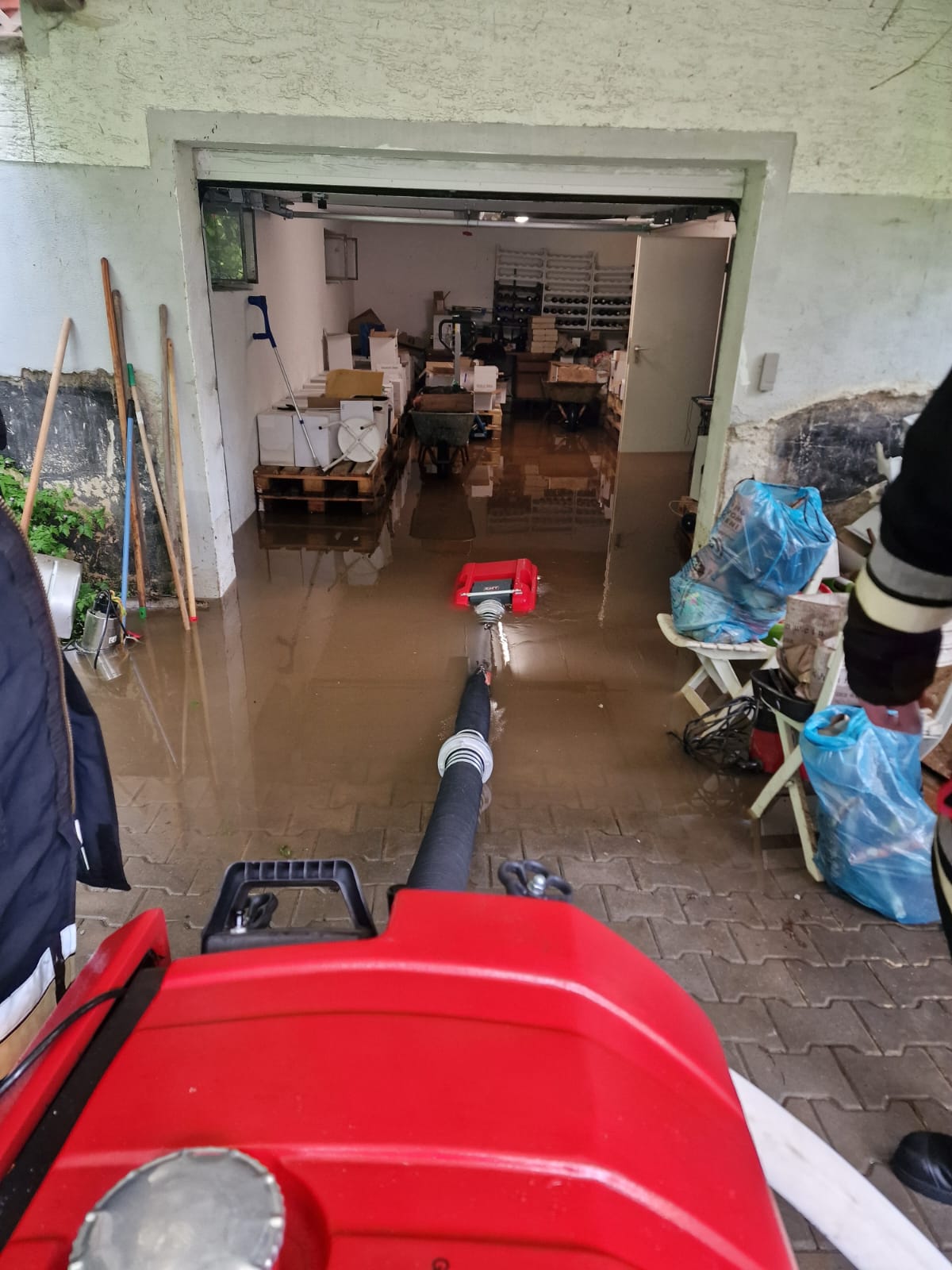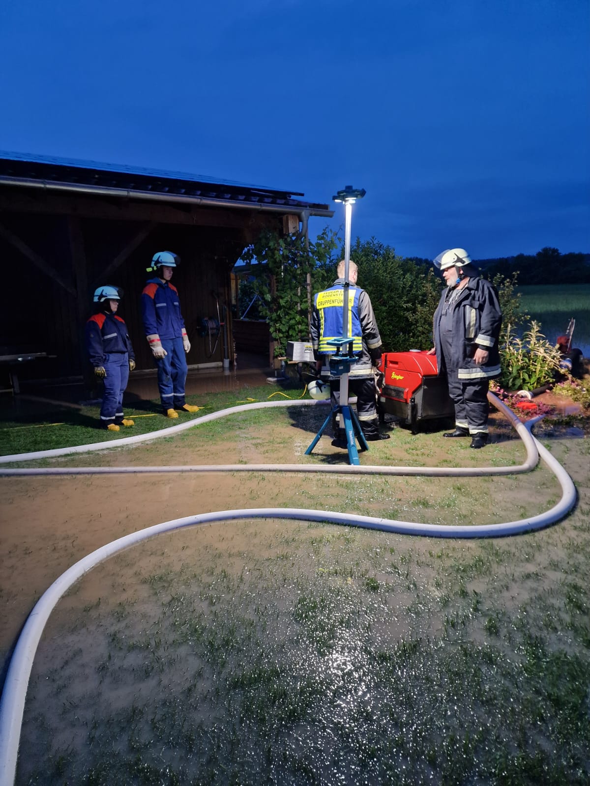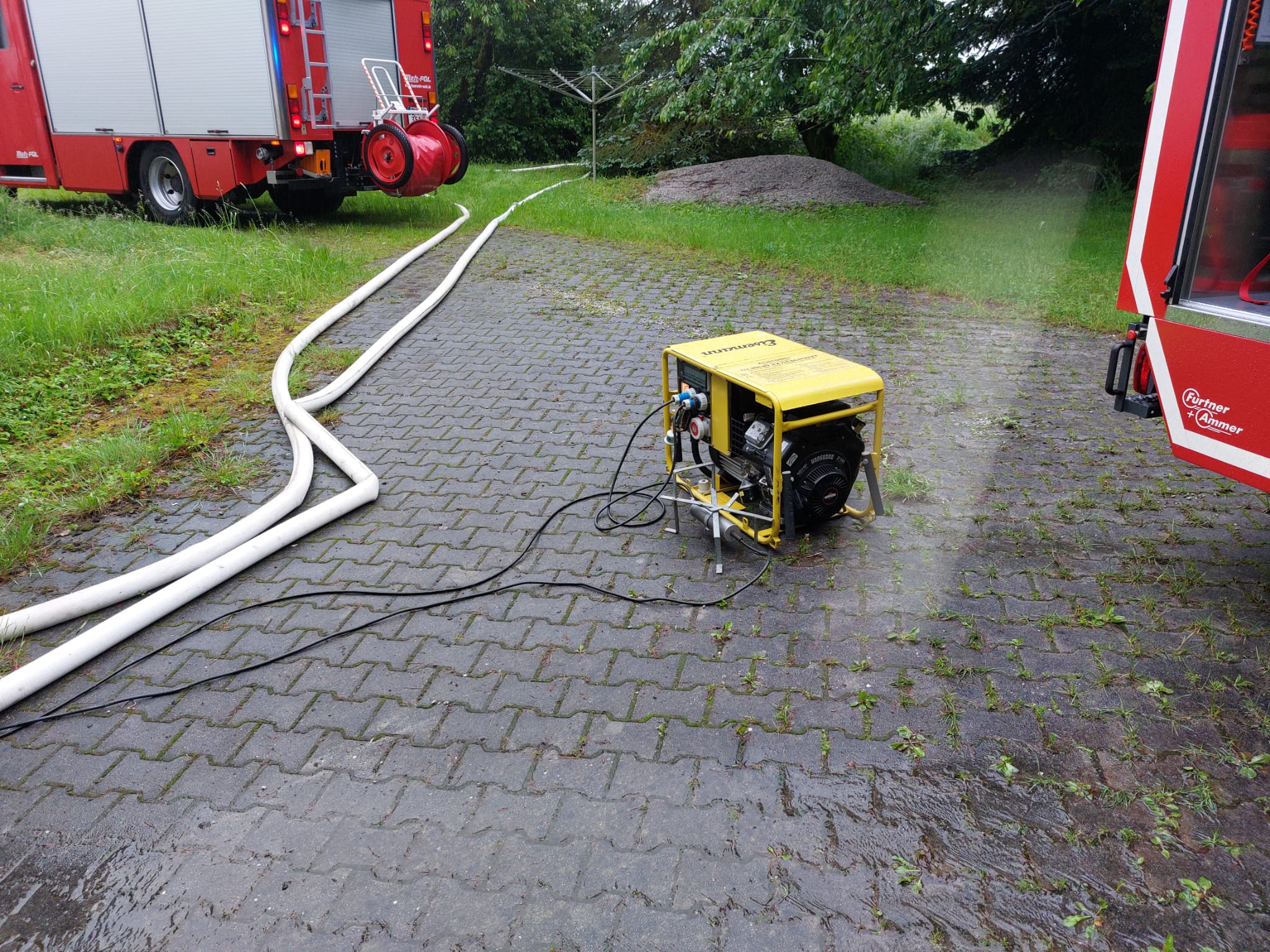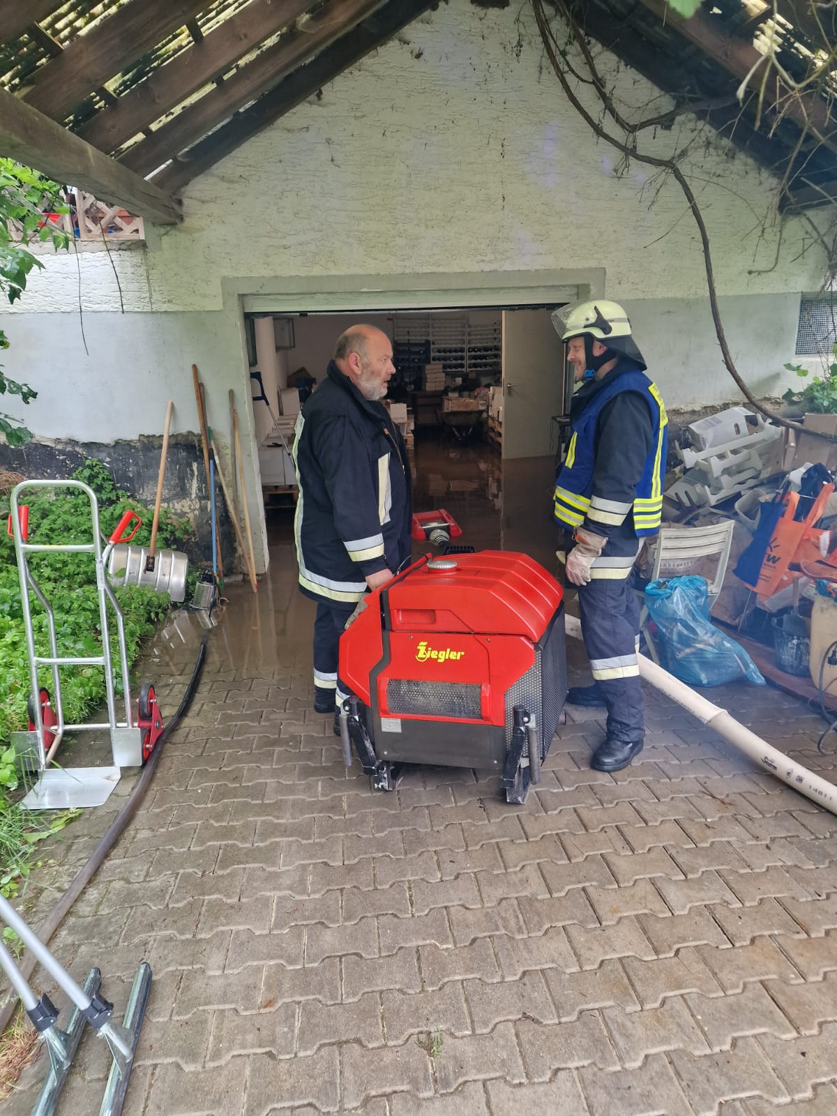 Die erste Alarmierung erfolgt aufgrund von Wasser im Keller in einem Anwesen in Asang. Dort angekommen wurde der Keller mit den Kameraden der Freiwilligen Feuerwehr Wald zusammen abgepumpt und ein Wassergraben errichtet, um den weiteren Regen am Haus vorbeizuleiten.