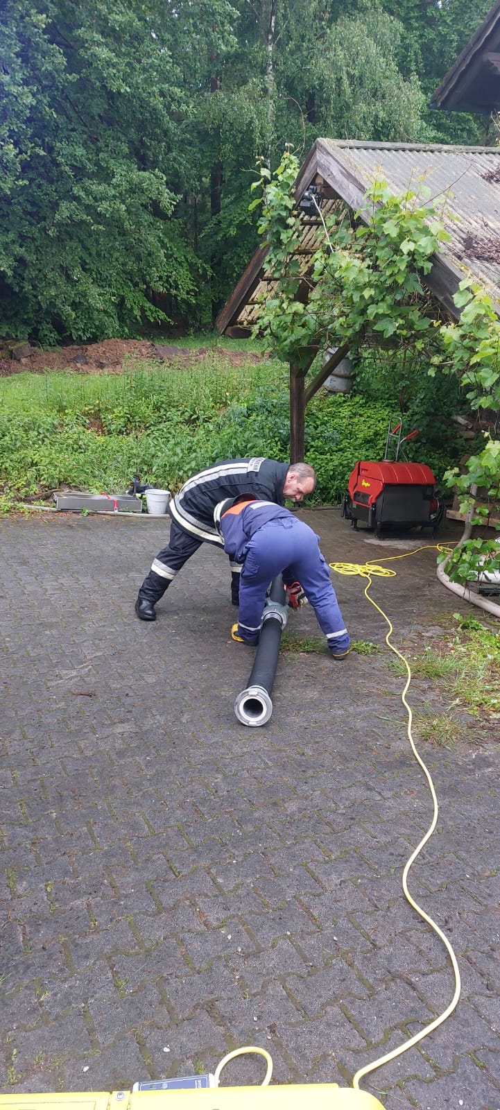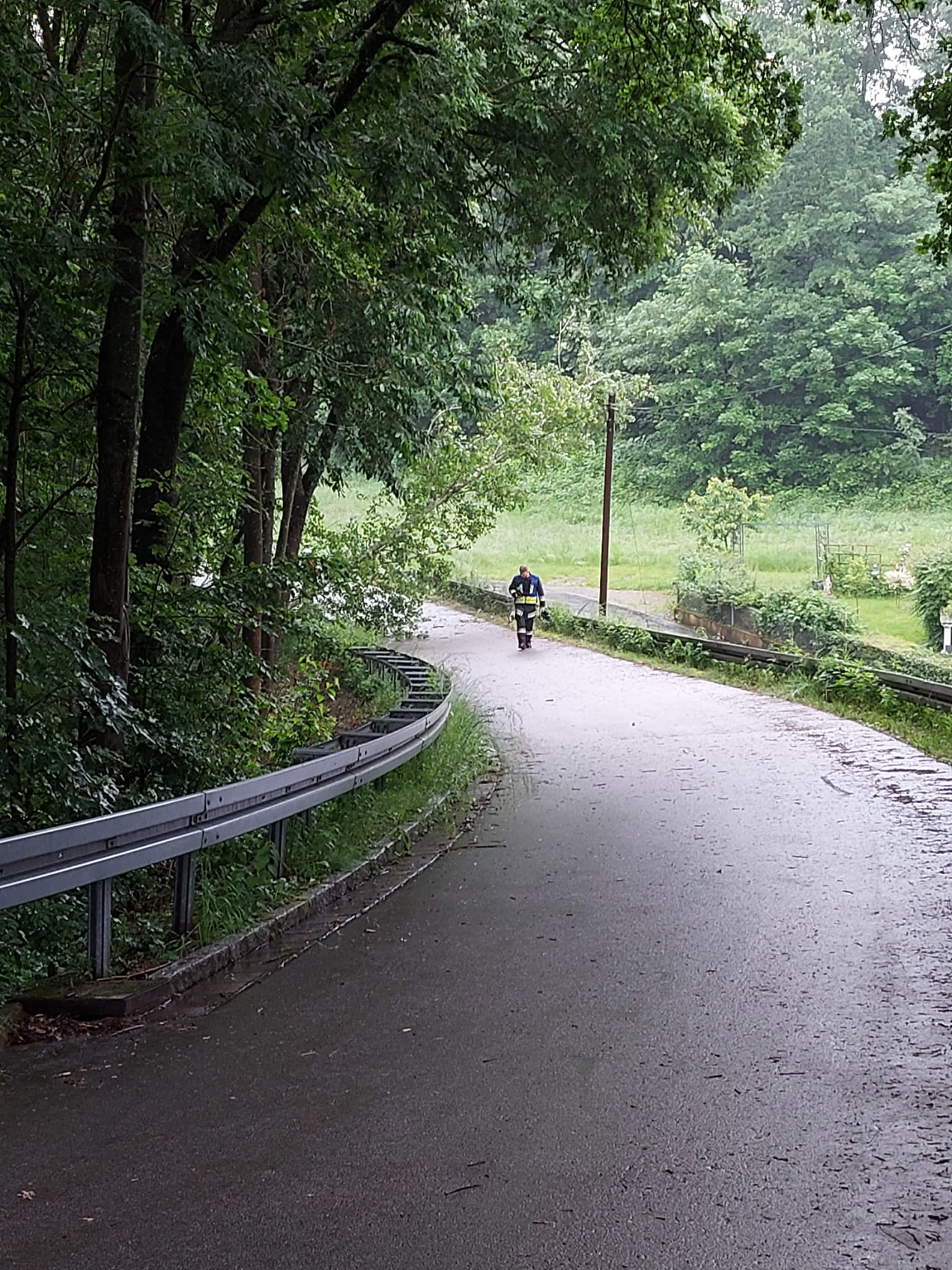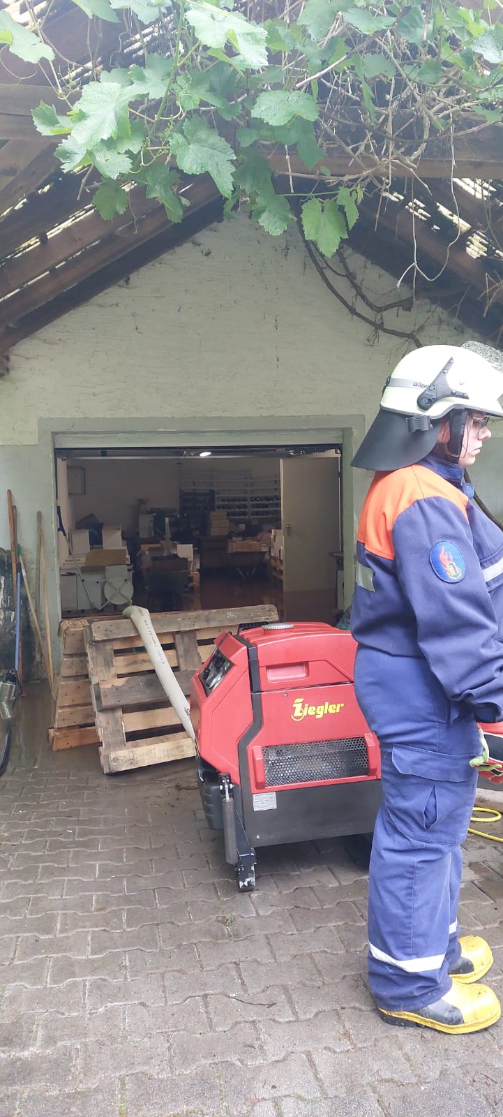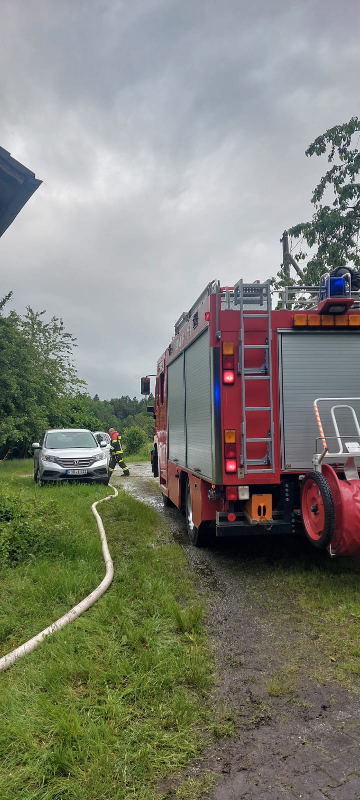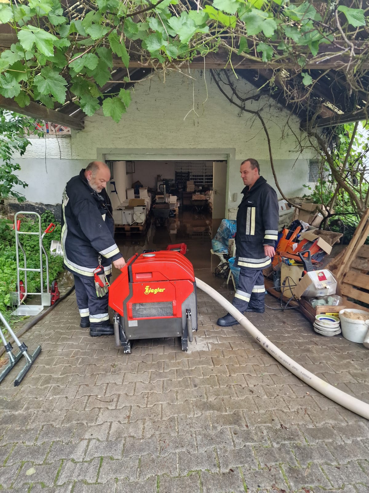 Die erste Alarmierung erfolgt aufgrund von Wasser im Keller in einem Anwesen in Asang. Dort angekommen wurde der Keller mit den Kameraden der Freiwilligen Feuerwehr Wald zusammen abgepumpt und ein Wassergraben errichtet, um den weiteren Regen am Haus vorbeizuleiten.