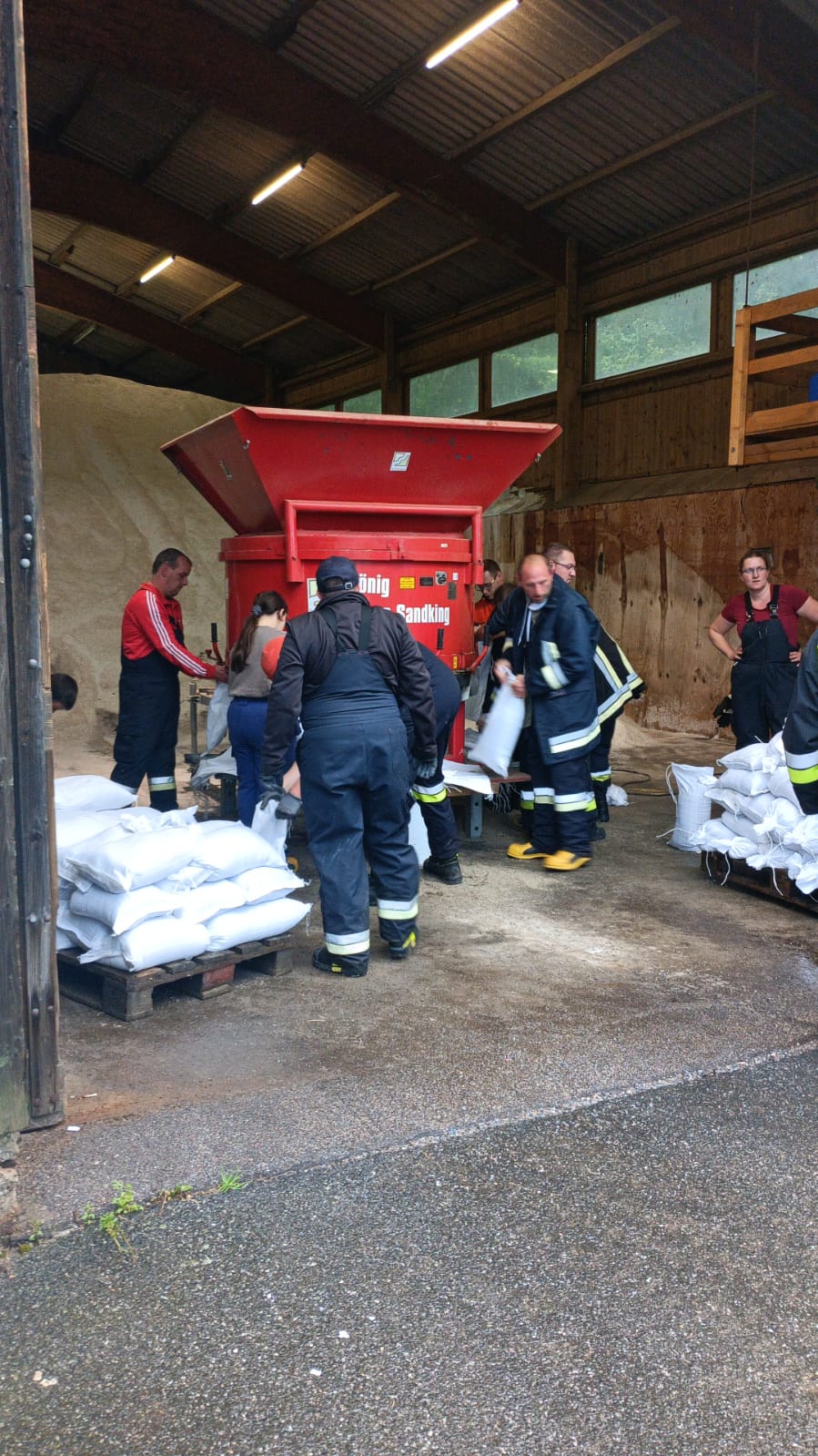 Direkt im Anschluss ging es nach Nittenau, um gemeinsam mit den Kameraden der FF Bergham 1.000 Sandsäcke zu befüllen. Diese wurden auf Paletten gesammelt, dass wenn der Regen weiter steigt, schnell reagiert werden kann.
