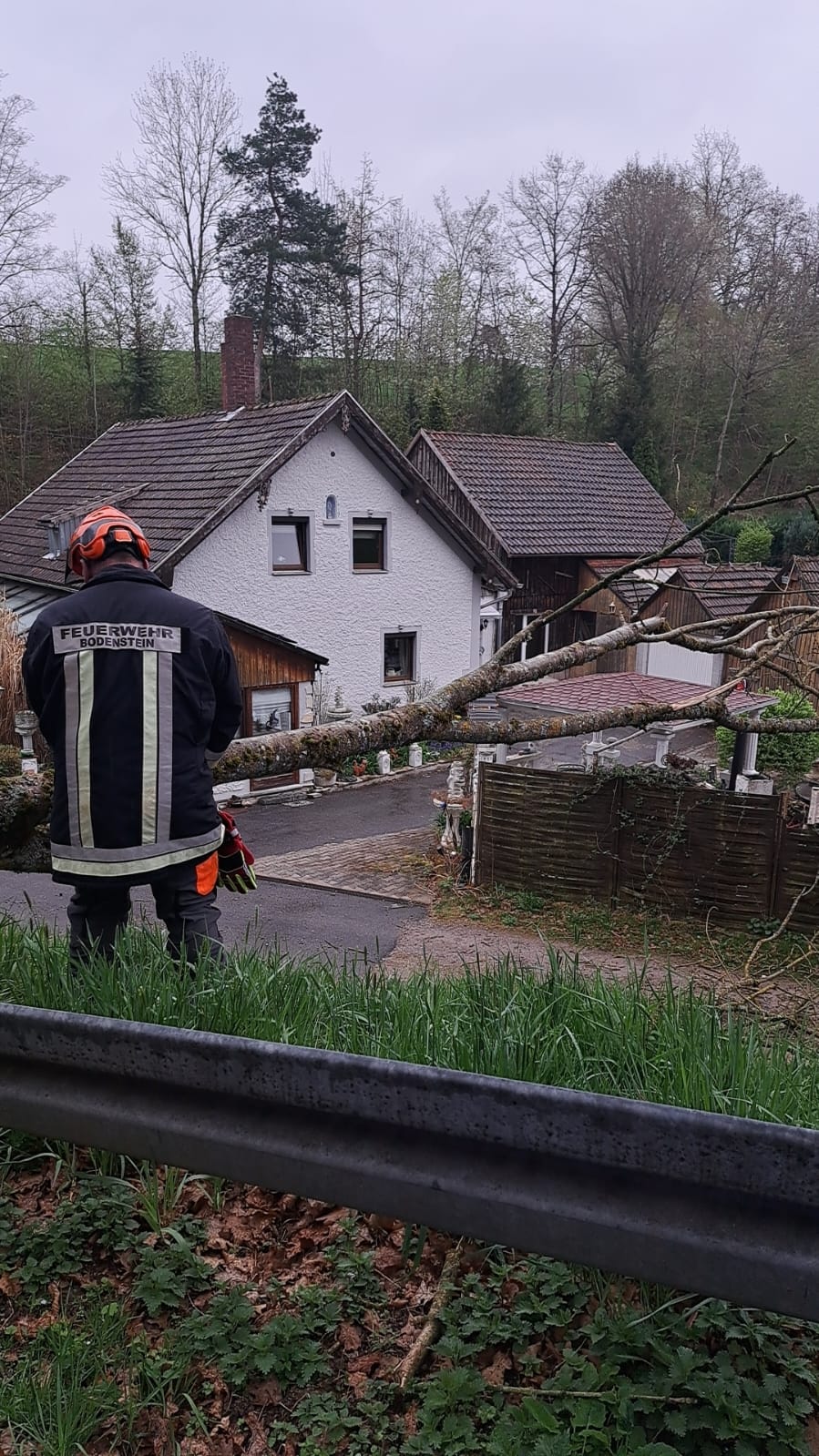 Am 18. April 2025 gegen 8:25 Uhr wurde zu einer technischen Hilfeleistung aufgrund eines umgestürzten Baums alarmiert. Daraufhin machten sich die Kameraden der Feuerwehr Bodenstein auf den Weg, um das Hindernis zu beseitigen. Bei der Ankunft wurde festgestellt, dass der Baum durch Auflage auf der Leitplanke unter Spannung stand. Somit konnte das Wissen aus dem erst kürzlich absolvierten Motorsägenkurs direkt angewendet werden. Nachdem die komplette Strecke abgesucht wurde und kein Baum auf der Straße zu finden war, wurde der Einsatz beendet und der Weg wieder freigemeldet. Allerdings wurde durch den Baum die Telefonleitung beschädigt, was zu einem Ausfall der Telefonverbindung in Michelsberg führte und später durch den Telekommunikationsanbieter gelöst wurde.