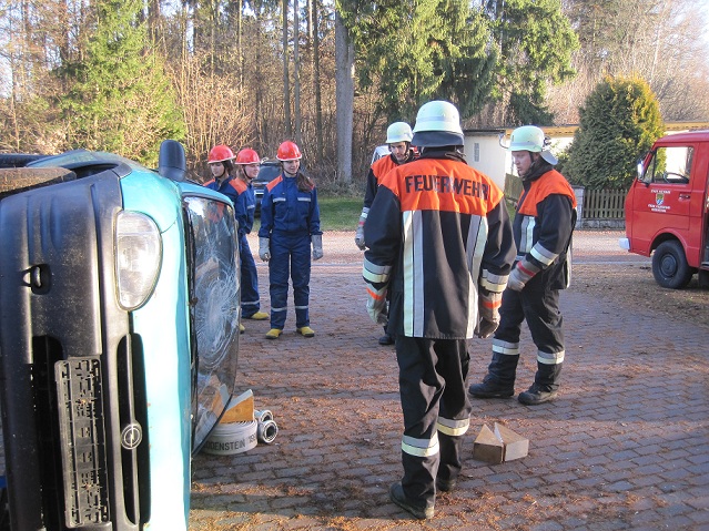 Eingeladen waren alle Aktiven ebenso wie die Mitglieder der Jugendfeuerwehr. Gegenstand der Übung war das richtige Verhalten nach einem Verkehrsunfall. Unter der Leitung der Kommandanten Sebastian Stadler und Manuel Aumann wurde die Rettung einer leicht verletzten Person aus einem auf der Seite liegenden PKW durchgespielt. Besonderes Augenmerk galt dabei der zügigen Stabilisierung des Fahrzeugs, die zum Erstaunen vieler auch mit den bescheidenen Gerätschaften einer Ortsfeuerwehr sehr gut möglich ist. Mit Hilfe der zweiteiligen Steckleiter, zweier Spanngurte, Holzkeilen und Feuerwehrschläuchen wurde das Fahrzeug bombenfest gesichert, anschließend konnte die verunglückte Person befreit werden. Rettungsassistent Florian Schillinger konnte allen Anwesenden auch aus dieser Sicht wichtige Ratschläge geben. Da Technische Hilfeleistung wie zum Beispiel nach Verkehrsunfällen längst neben dem Brandschutz die wichtigste Aufgabe der Feuerwehren ist,