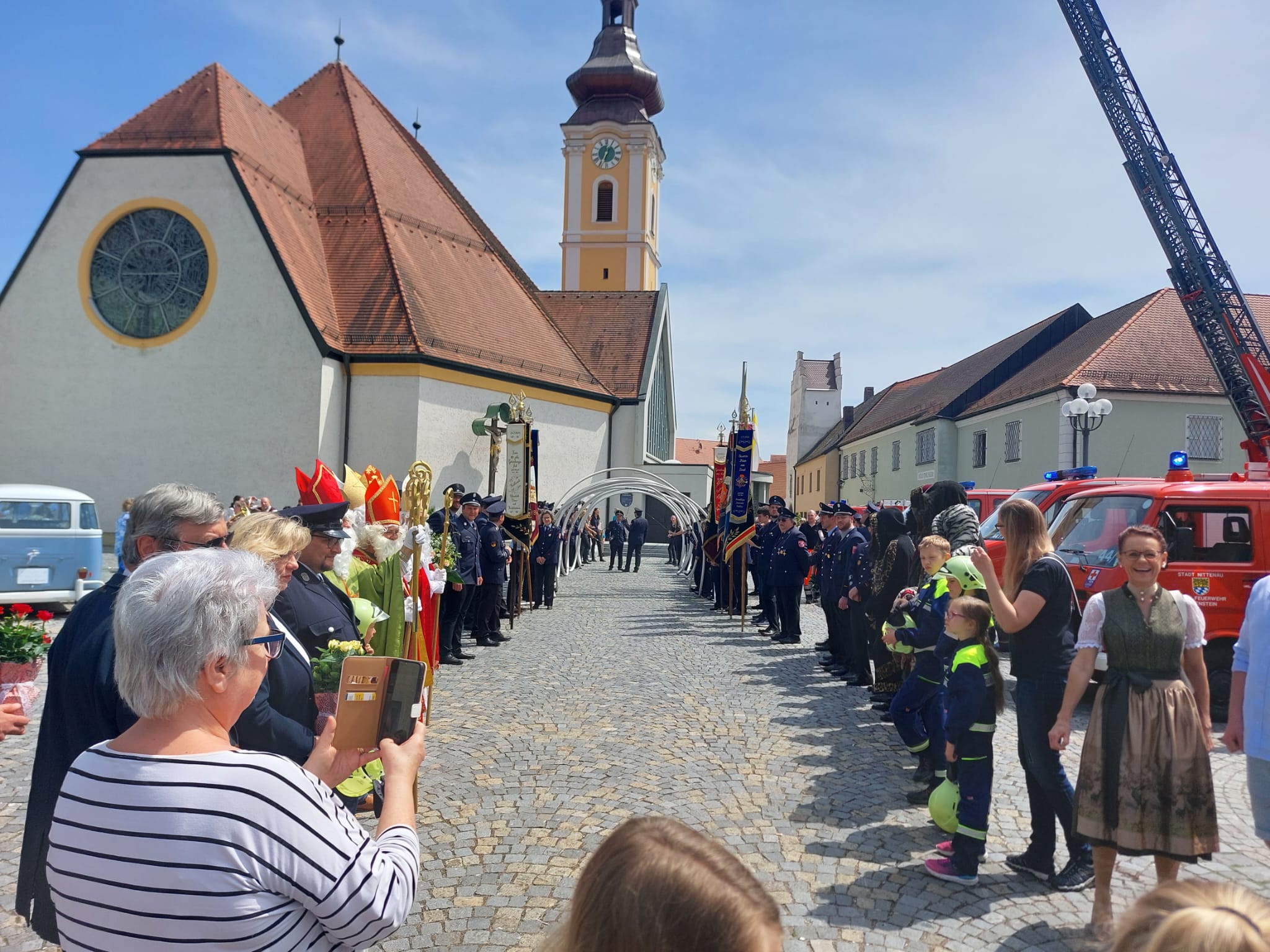 Standesamtlich hat Nittenaus Rathauschef bereits im vergangenen September geheiratet. Nun folgte die kirchliche Trauung, die Stadtpfarrer Adolf Schöls zelebrierte. „Nähe ist bei uns kein Zufall, sondern Absicht“ – diesen alten Werbeslogan der Sparkasse hatte sich Schöls als Leitfaden für seine Predigt ausgewählt. Kein Wunder, denn bei der Sparkasse haben sich Bürgermeister Boml und seine Frau kennengelernt. Dort arbeitete der 40-Jährige bis zu seiner Wahl zum Rathauschef im Jahr 2020, seine Angetraute Katharina Leopold (31) ist dort immer noch in der Kreditabteilung tätig. Bei einem Betriebsausflug nach Nürnberg hätten sich die beiden 2017 kennengelernt – und schnell habe es zwischen ihnen auch gefunkt, sagte Schöls. Er gab den beiden einige Ratschläge für eine gute Ehe mit auf den Weg und riet ihnen unter anderem, viel miteinander zu sprechen, gemeinsame Unternehmungen zu pflegen, sich über Gefühle auszutauschen und sich ihre Zärtlichkeit füreinander zu bewahren. Doch das Paar solle auch Gott nicht vergessen. „Leben ist mehr als Geld und Zinsen, Rackern und Action“, so Schöls weiter. Als die frisch Vermählten nach dem Gottesdienst durch das Kirchenportal traten, erwartete sie ein beeindruckendes Bild: Der Vorplatz war voll mit Fahrzeugen der Feuerwehren aus Nittenau und seinen Ortsteilen. Für Boml und seine Braut hatten sie ein Schlauchspalier vorbereitet, das die beiden unter lautstarker Martinshornbegleitung durchschritten. Die Nittenauer Feuerwehrler hatten sich aber noch etwas ganz Besonderes einfallen lassen: Sie hatten die Drehleiter mit dabei und hievten das frisch getraute Paar damit in die Lüfte. Auch die Stadtkapelle Nittenau stand parat und spielte für die Hochzeitsgesellschaft kräftig auf. Natürlich durfte auch die Braut selbst einen Marsch dirigieren. Unter der Gratulantenschar befanden sich auch ihre Reiterfreunde, ebenso wie zahlreiche weitere Vereinsvertreter, Stadtratsmitglieder und Nittenauer Bürger. Viele wollten es sich nicht entgehen lassen, Braut und Bräutigam aus der Nähe zu begutachten und ihnen für ihren gemeinsamen Lebensweg viel Glück zu wünschen. Am Ende stiegen Bürgermeister Boml und seine Katharina in ihr Brautauto, einen hellblau-weißen Bulli, mit dem sie sich auf den Weg zur weltlichen Feier machten. Text: Cornelia Lorenz (MZ)